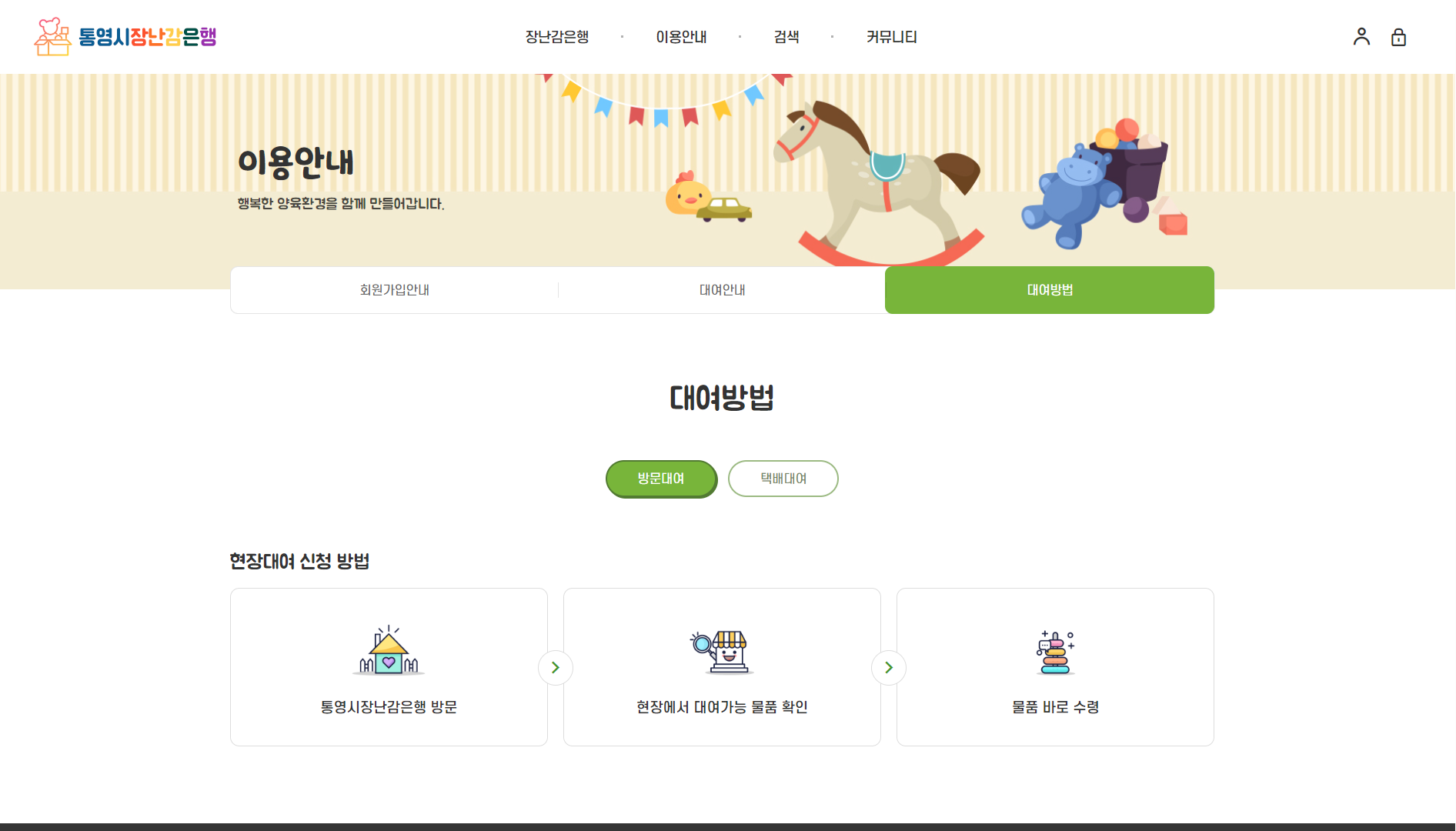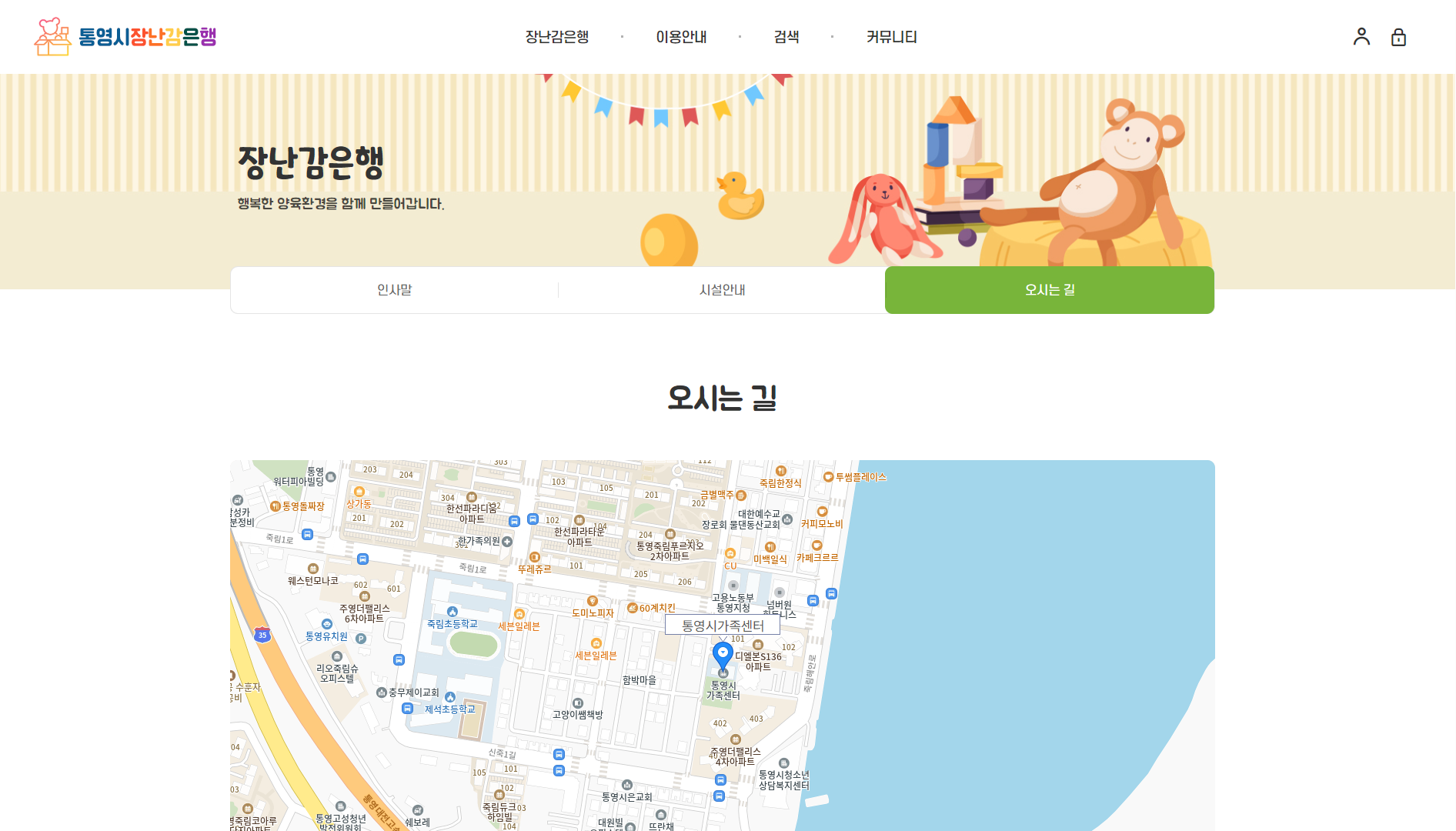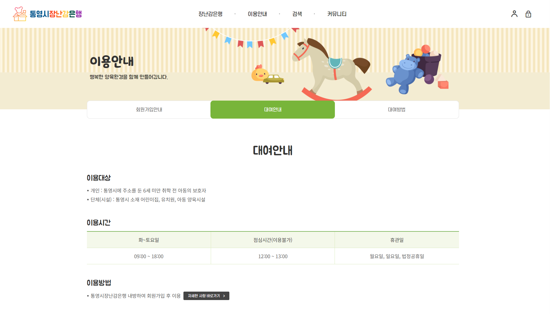통영시 장난감은행 홈페이지이기에 유아나 보호자 분들이 주 방문자들임을 감안하여 전체적인 디자인을 귀여운 인상과 포근한 느낌을 주려고 노력하였습니다. 반응형 홈페이지이기에 상단 드롭바 메뉴 형식을 채택하여 직관적인 메뉴 선택이 되게 하였습니다. 방문자들에게 심플한 디자인을 제공하여 유저 인터페이스 편의성을 상승시켰습니다.