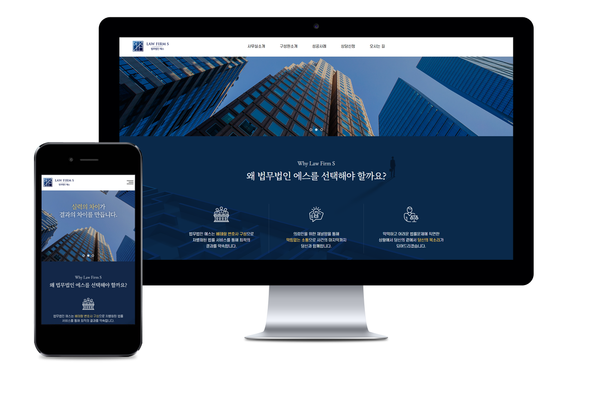 법무법인 에스의 통영사무소 홈페이지입니다. 법무법인이기에 방문자에게 강한 신뢰성을 주기 위해 짙은 남색과 갈색, 다크 그레이를 메인 칼러로 디자인했습니다. 정보 제공의 직관성을 주기 위해 상단 고정 드롭바 메뉴 형식을 채택했습니다.