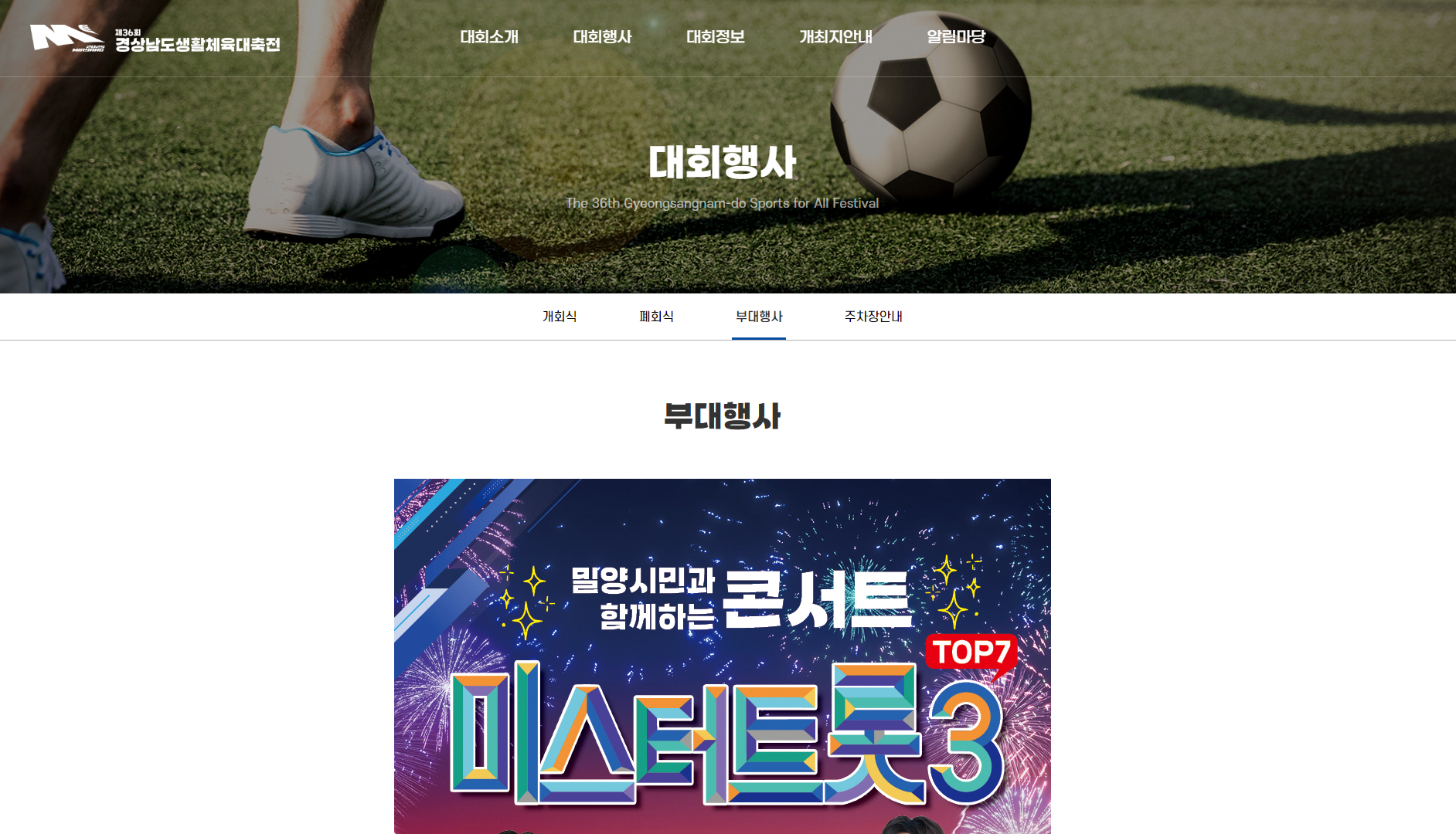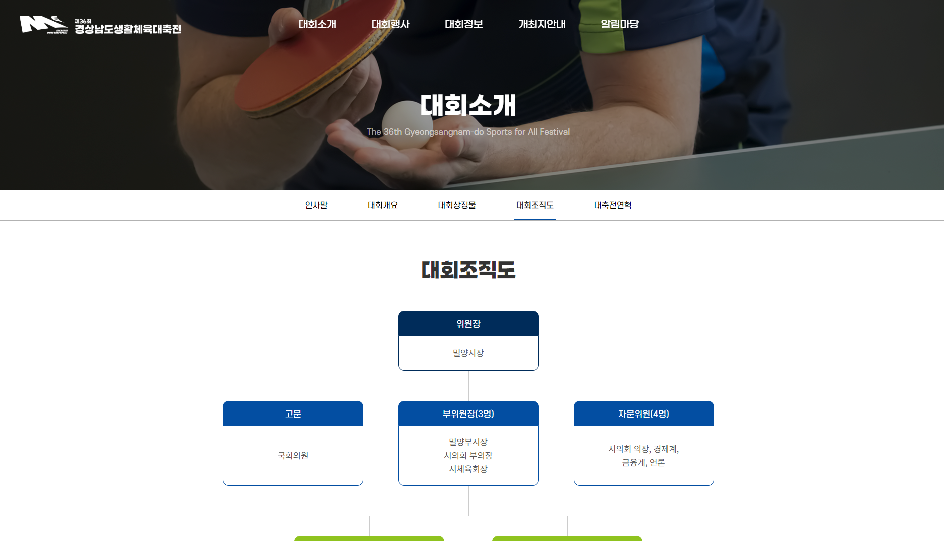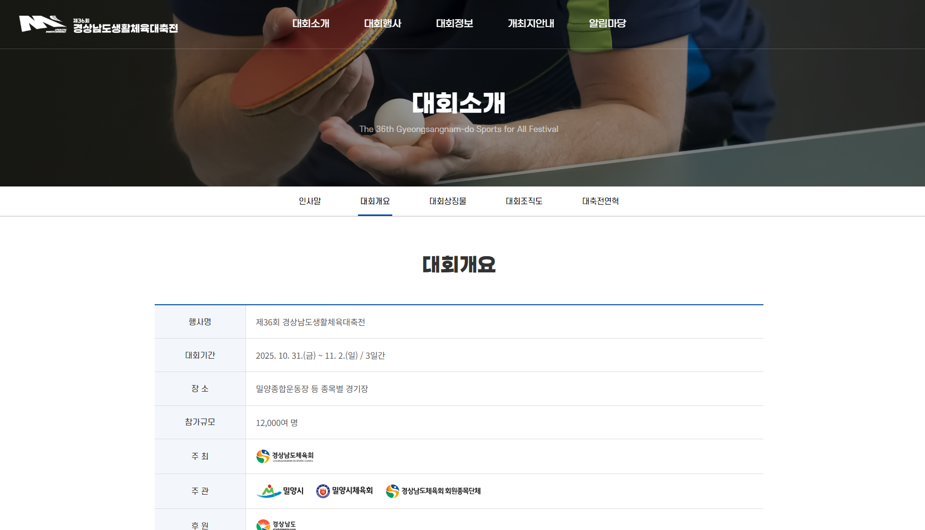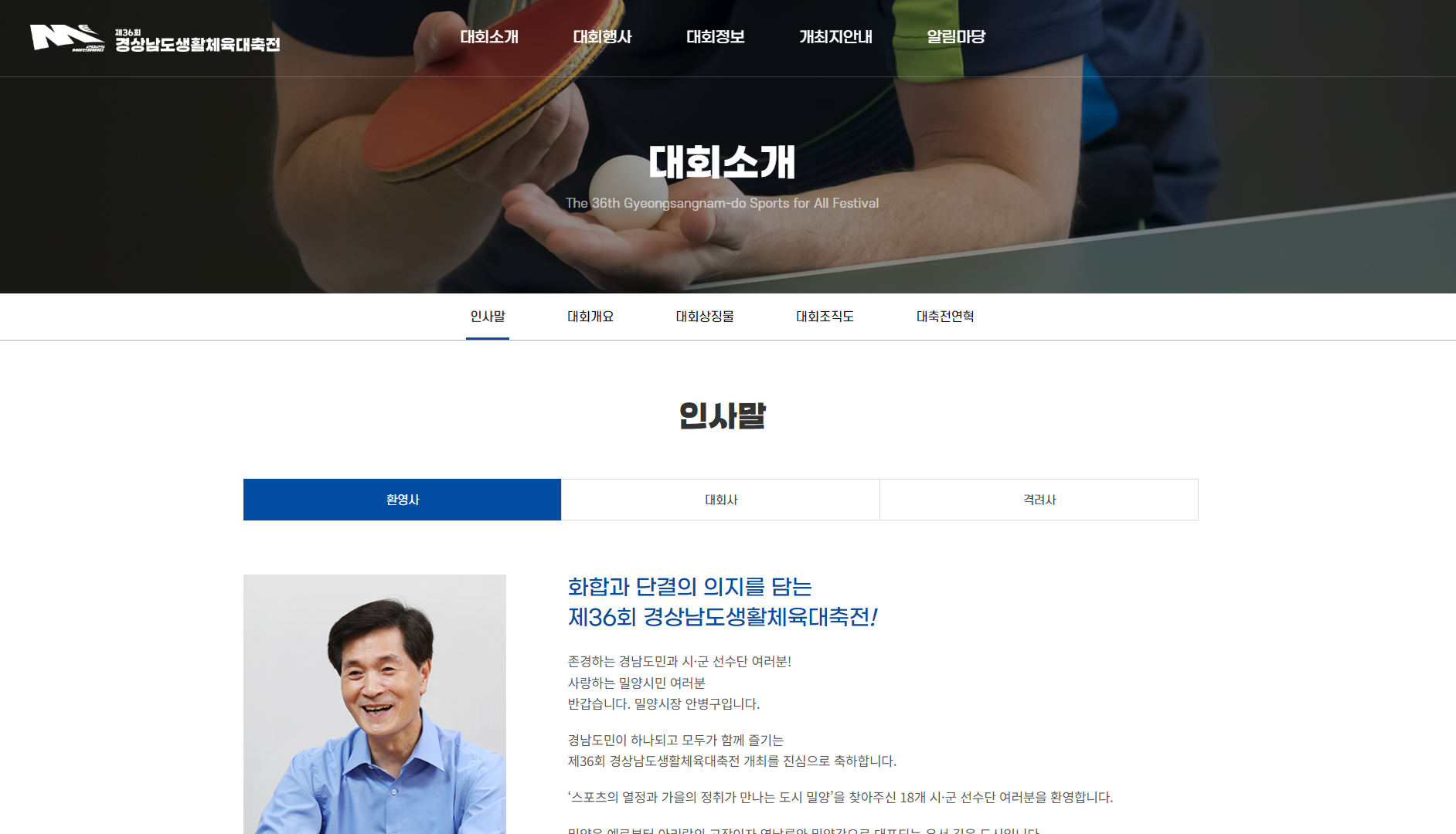 밀양시 일원에서 개최되는 제36회 경상남도 생활체육대축전 공식 홈페이지입니다. 전체적으로 생활체육대축전 정보를 한눈에 볼 수 있게 메뉴 구성을 상단 고정형으로 디자인하여 사용자 인터페이스 편의성을 극대화시켰습니다. PC와 모바일 홈페이지 디자인 통영을 위하여 반응형 시스템으로 구축되었으며 전체적인 디자인을 간결하게 구상하였습니다.