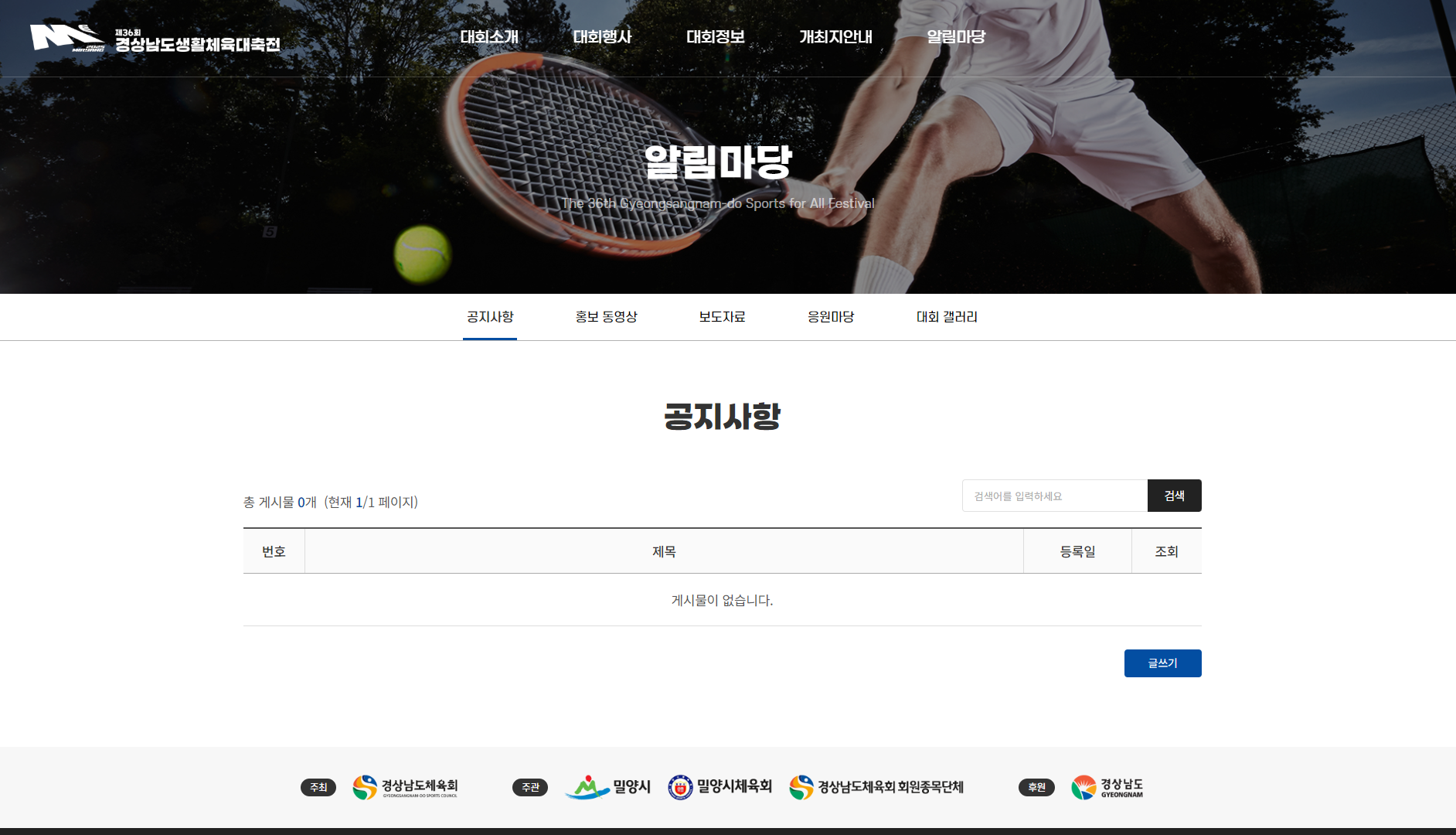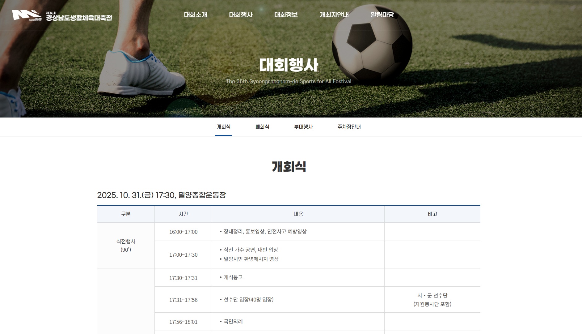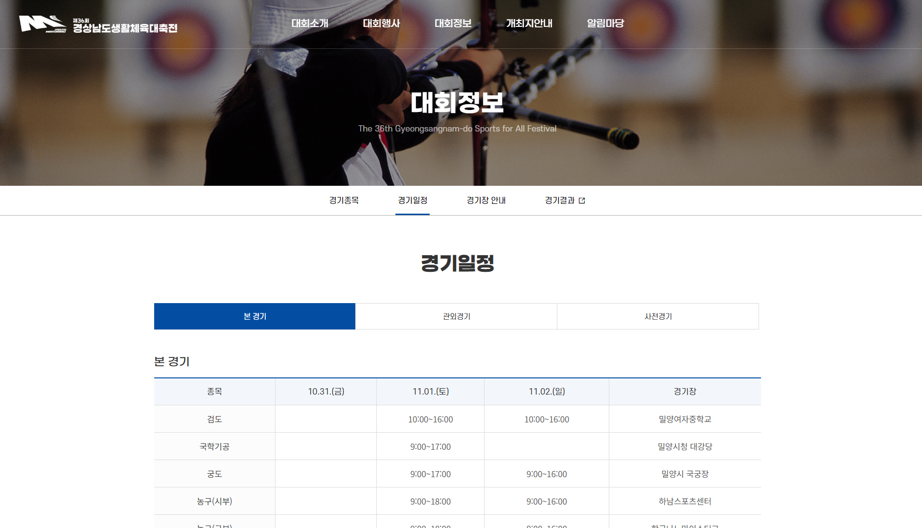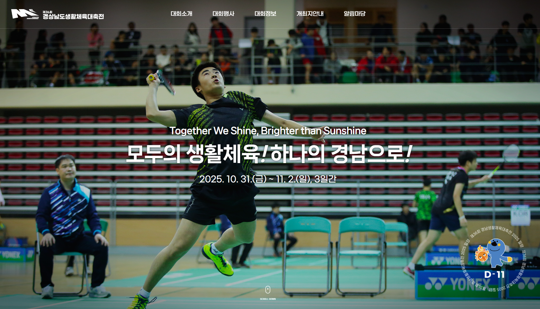 밀양시 일원에서 개최되는 제36회 경상남도 생활체육대축전 공식 홈페이지입니다. 전체적으로 생활체육대축전 정보를 한눈에 볼 수 있게 메뉴 구성을 상단 고정형으로 디자인하여 사용자 인터페이스 편의성을 극대화시켰습니다. PC와 모바일 홈페이지 디자인 통영을 위하여 반응형 시스템으로 구축되었으며 전체적인 디자인을 간결하게 구상하였습니다.